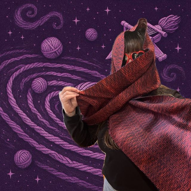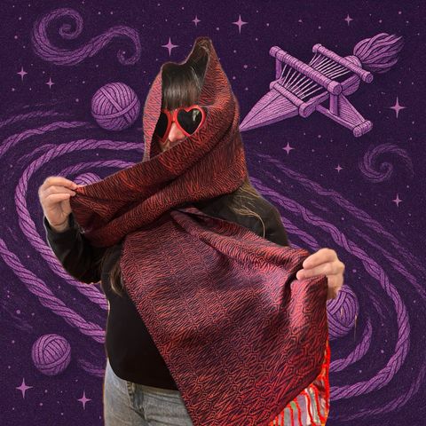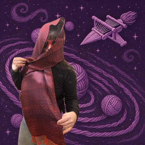A esta pashmina la tejió Chispa con el telar de 8 cuadros. Lleva 400 hilos de urdimbre y está realizada con lana dralon 2/32, finísima y ligera. Pesa apenas 100 gramos, abrigadita pero livianita, y mide 38 cm de ancho por 200 de largo.
