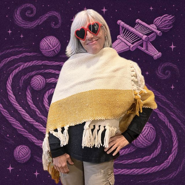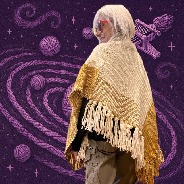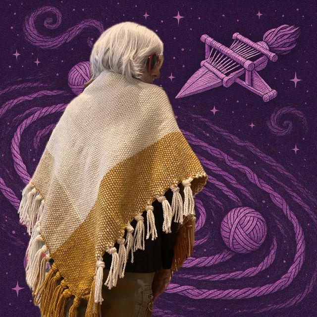 Versión libre de una ruana, con espalda triangular, tejida en telar de peine con lana de oveja color natural y teñida con cáscara de cebolla Ver más detalles